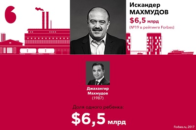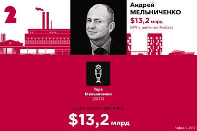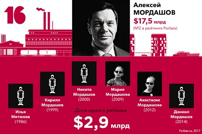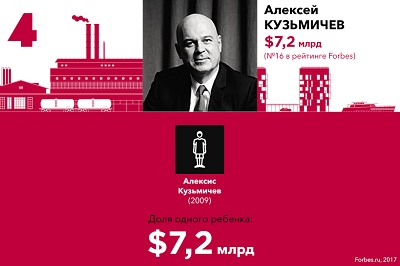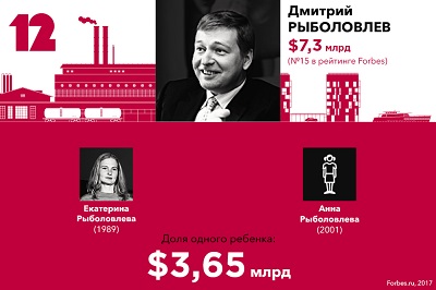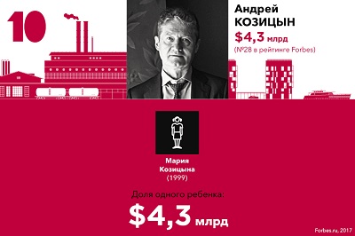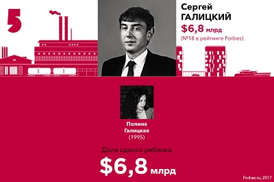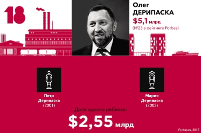 В списке наследников богатейших предпринимателей Forbes представляет 20 семей, где на каждого ребенка приходится не менее $2,3 млрд. Общее количество детей в этих семьях — 47. Новичком этого года стала семья крупнейшего акционера UC Rusal Олега Дерипаски F 23, ему уступил место бывший владелец МДМ Банка Сергей Попов F 27.