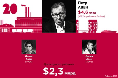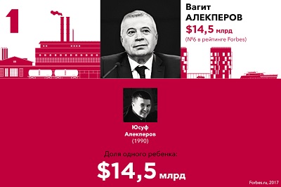 Самым богатым наследником ($14,5 млрд), как и в прошлом году, стал Юсуф Алекперов, единственный сын президента «Лукойла» Вагита Алекперова F 6. На последнем, 20-м месте — дети председателя совета директоров банковской группы «Альфа-Банк» Петра Авена Денис и Дарья, на каждого из них приходится по $2,3 млрд.